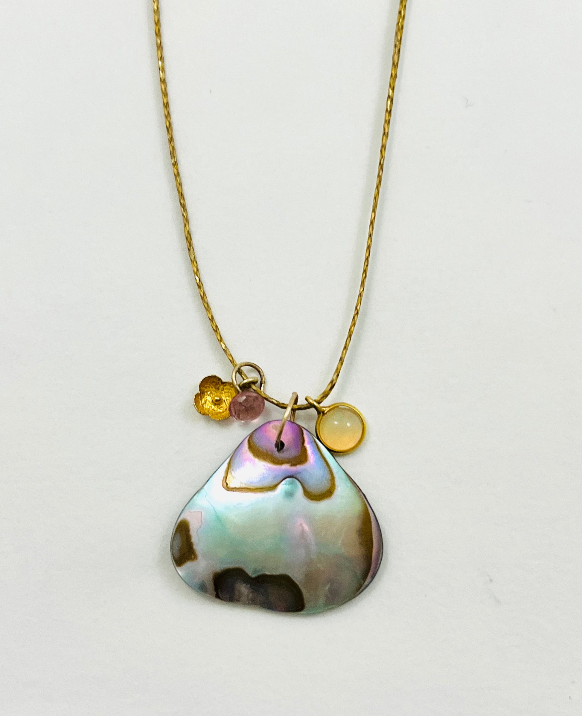 A found abalone shell 14k charm is the star of the show in this design. An 18k gold bezeled opal, 18k gold flower, and 14k gold pink tourmaline charm are the accents. All are suspended from hand made, metallic Greek cord. 14k gold lobster clasp. 17 inches. Message me for custom length.