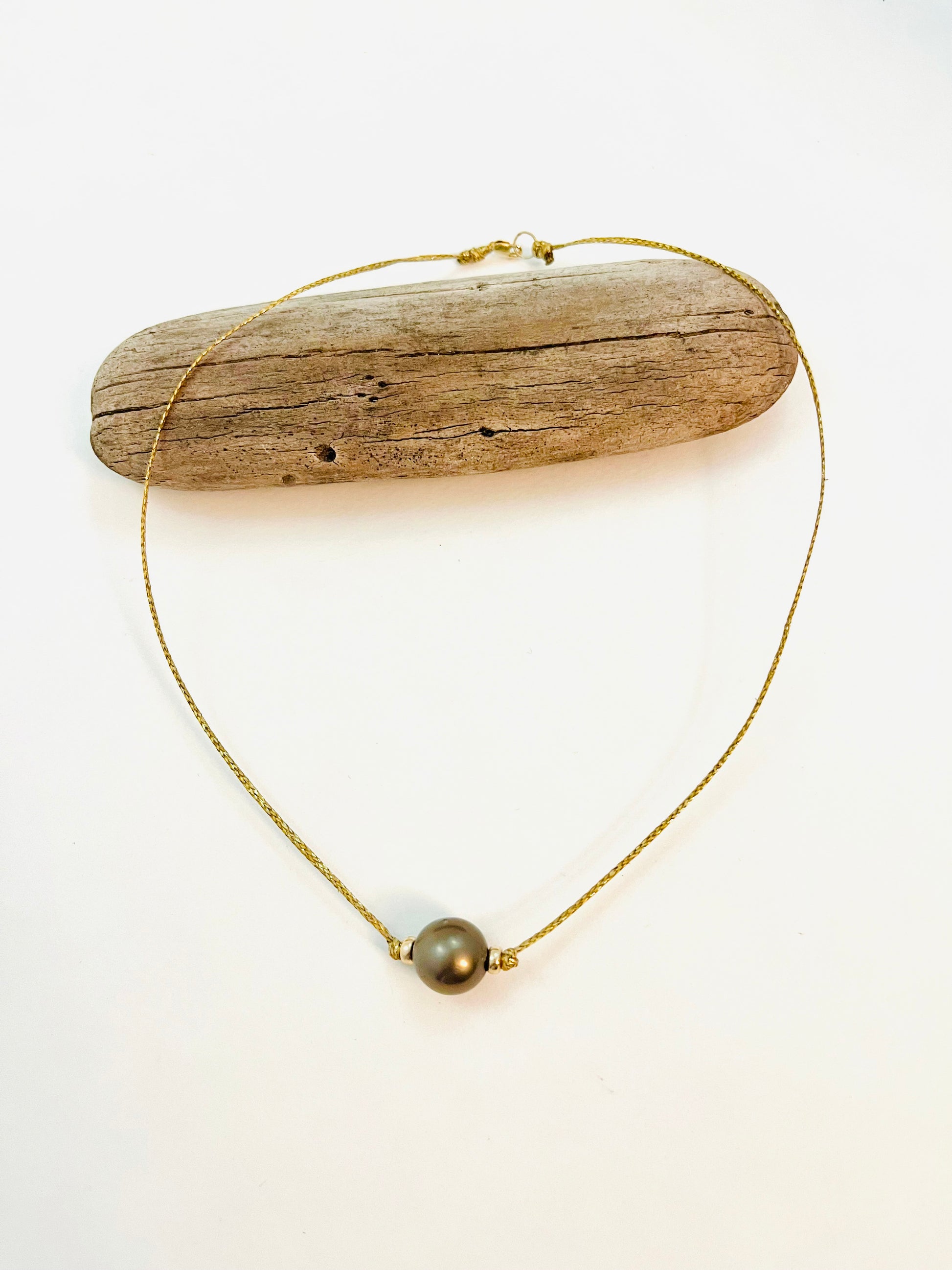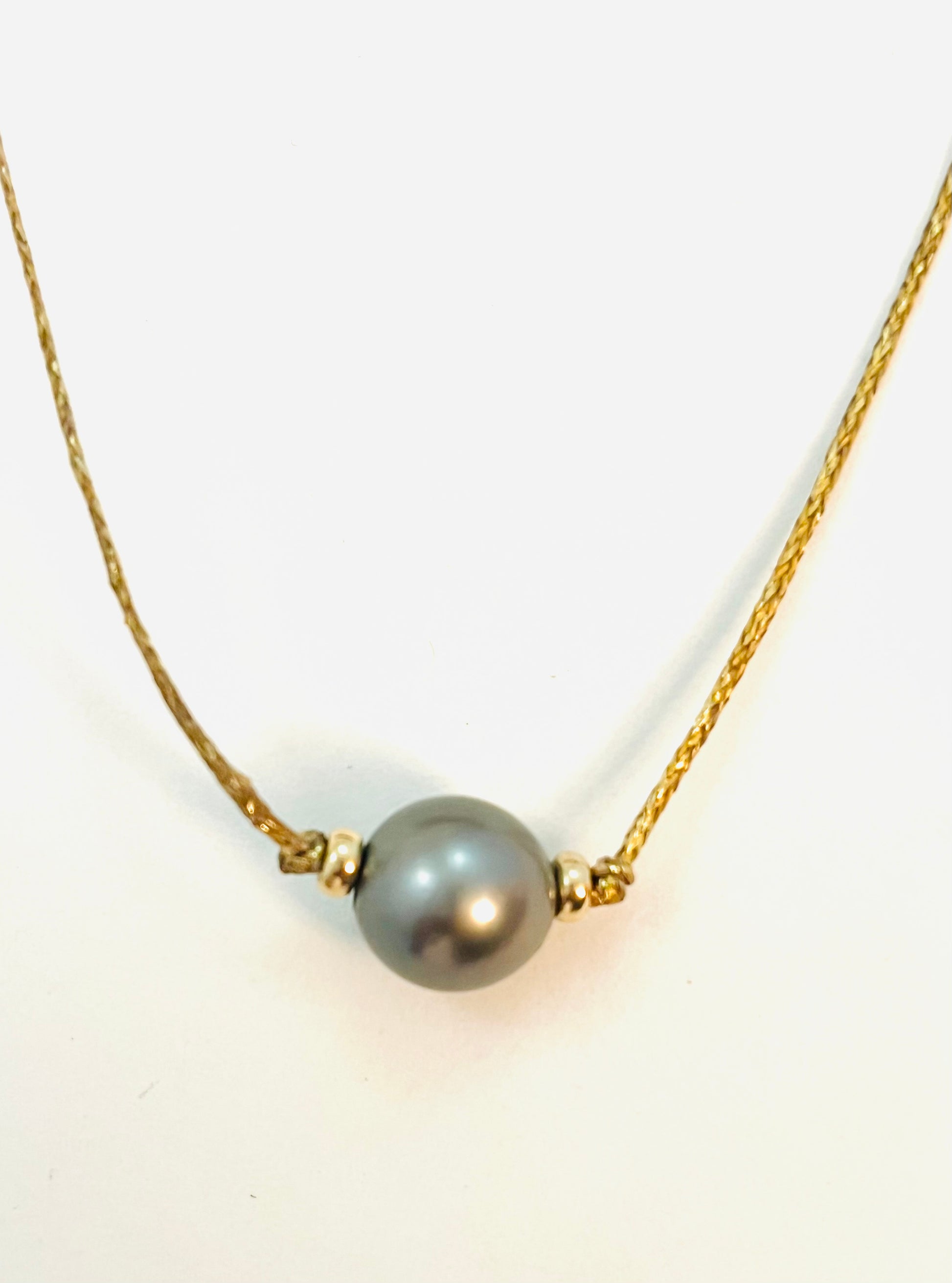 A large and lustrous silver Tahitian pearl is accented by two 14k gold beads, strung and knotted onto hand-made, metallic Greek cord. 14k gold lobster clasp. Choose your length.