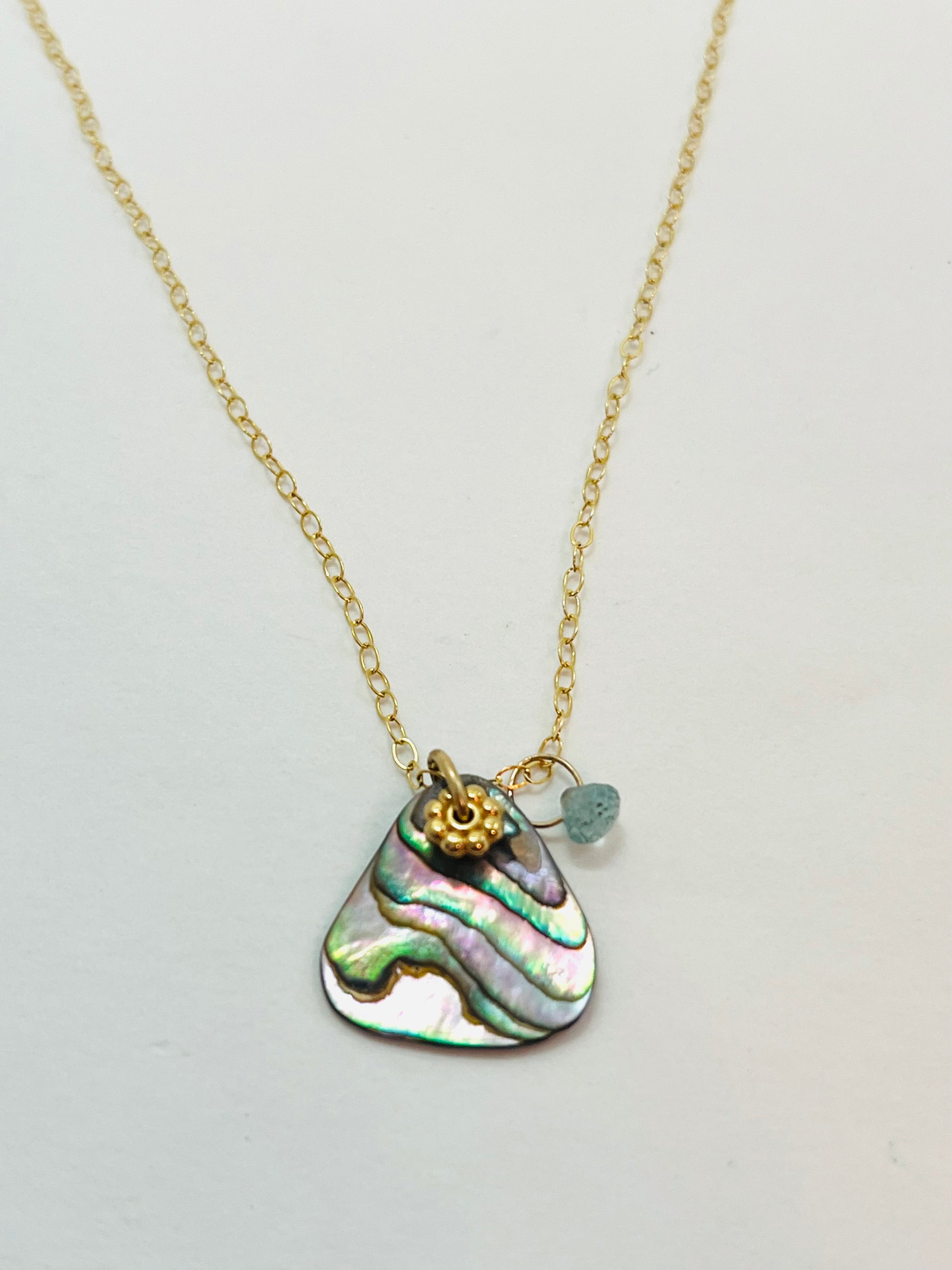 The Allegra necklace features a piece of found abalone shell, accented with a 14k gold fill Bali bead and hand-made 14k gold fill tourmaline charm. All are suspended from a delicate 14k gold filled cable chain. 14k gold fill spring clasp. 16 inches.