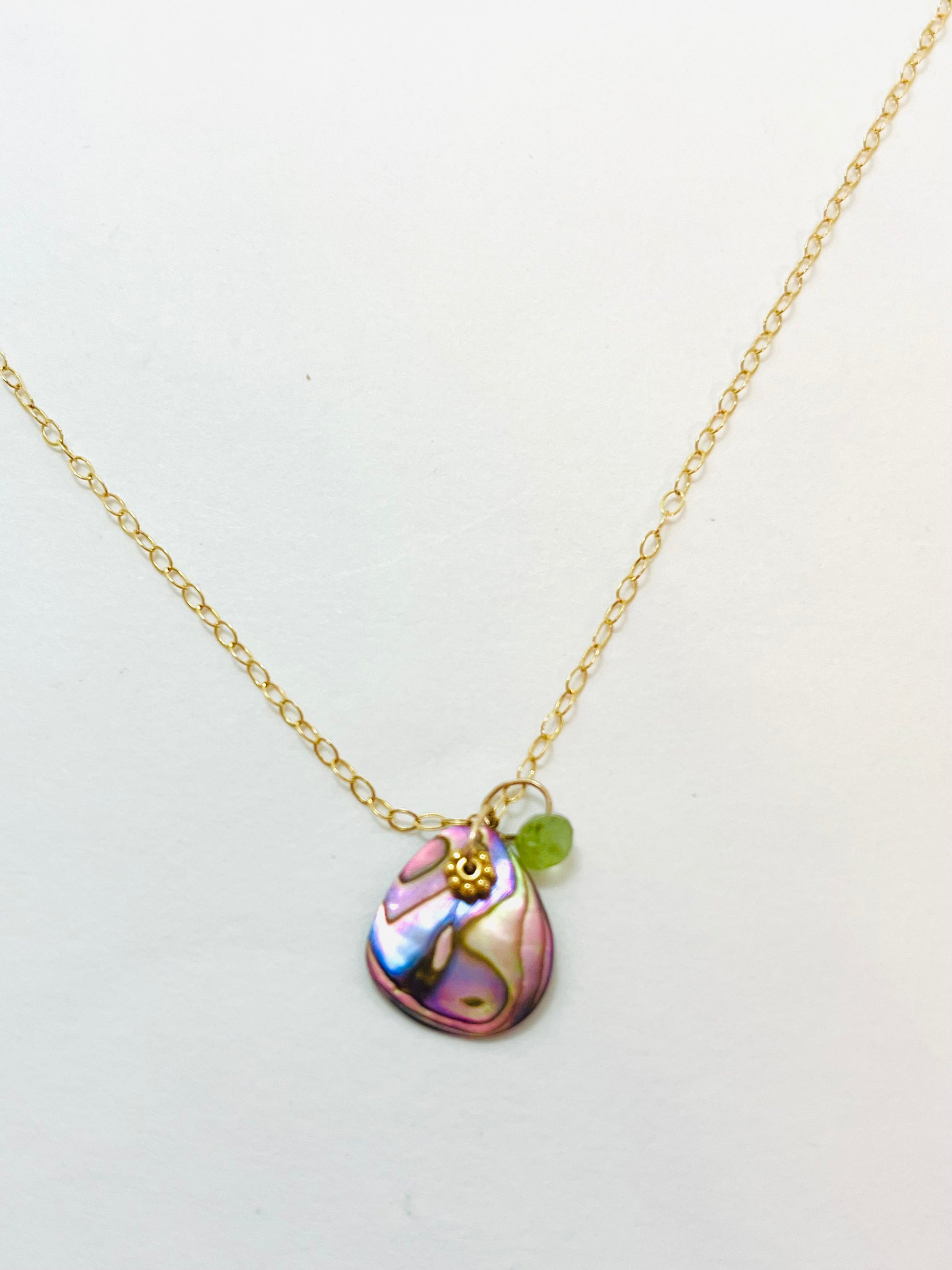 The Allegra necklace features a piece of found abalone shell, accented with a 14k gold fill Bali bead and hand-made 14k gold fill tourmaline charm. All are suspended from a delicate 14k gold filled cable chain. 14k gold fill spring clasp. 16 inches.