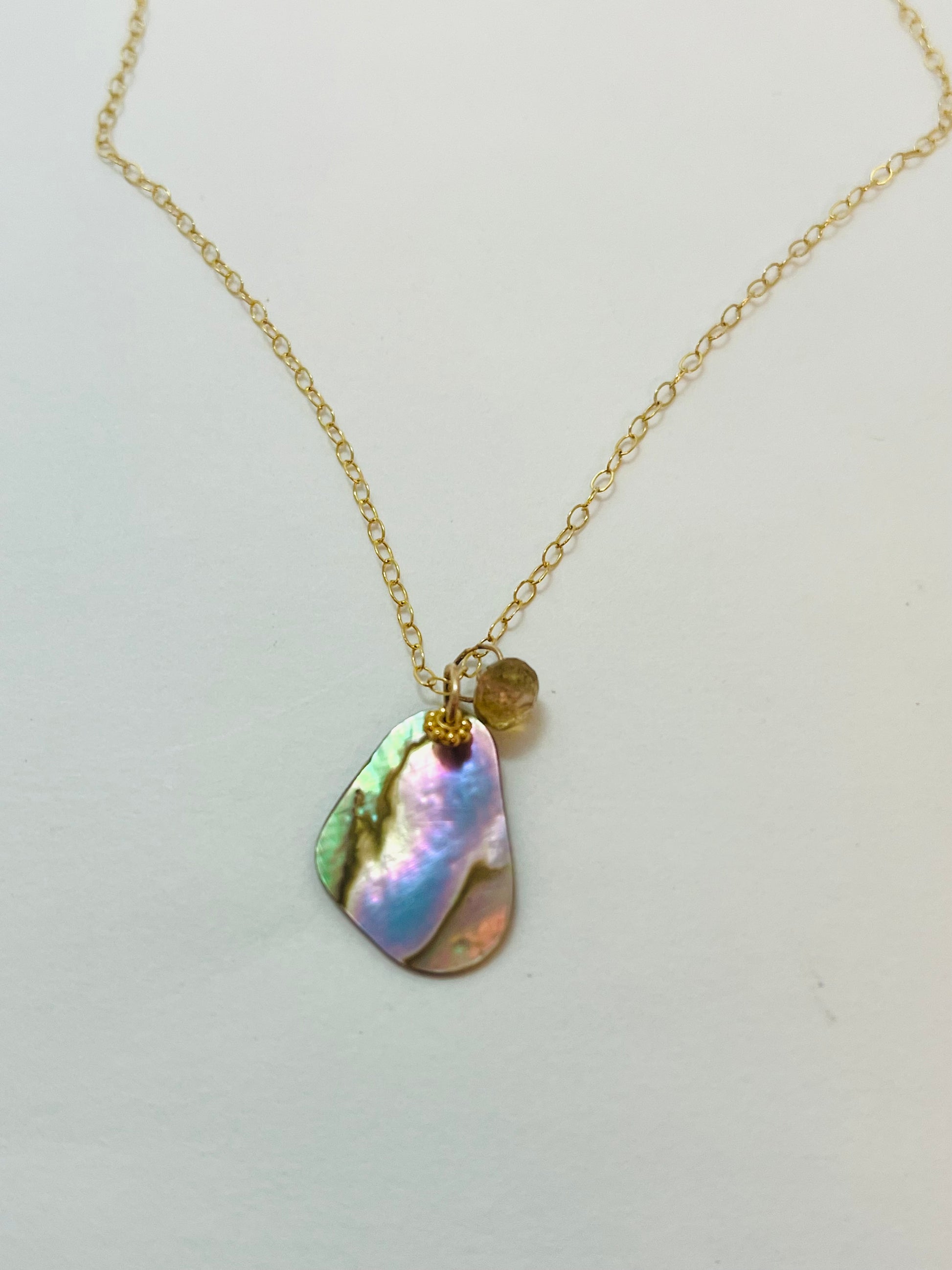 The Allegra necklace features a piece of found abalone shell, accented with a 14k gold fill Bali bead and hand-made 14k gold fill tourmaline charm. All are suspended from a delicate 14k gold filled cable chain. 14k gold fill spring clasp. 17 inches.