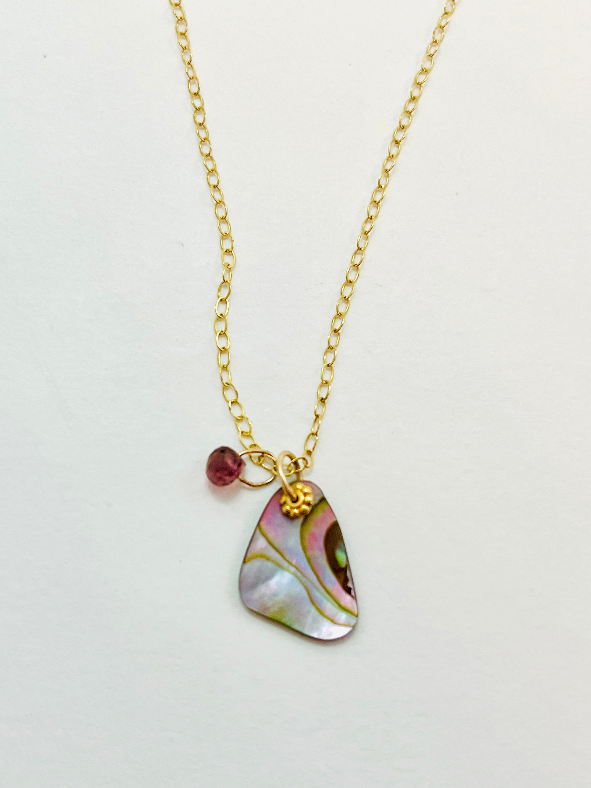 The Allegra necklace features a piece of found abalone shell, accented with a 14k gold fill Bali bead and hand-made 14k gold fill tourmaline charm. All are suspended from a delicate 14k gold filled cable chain. 14k gold fill spring clasp.