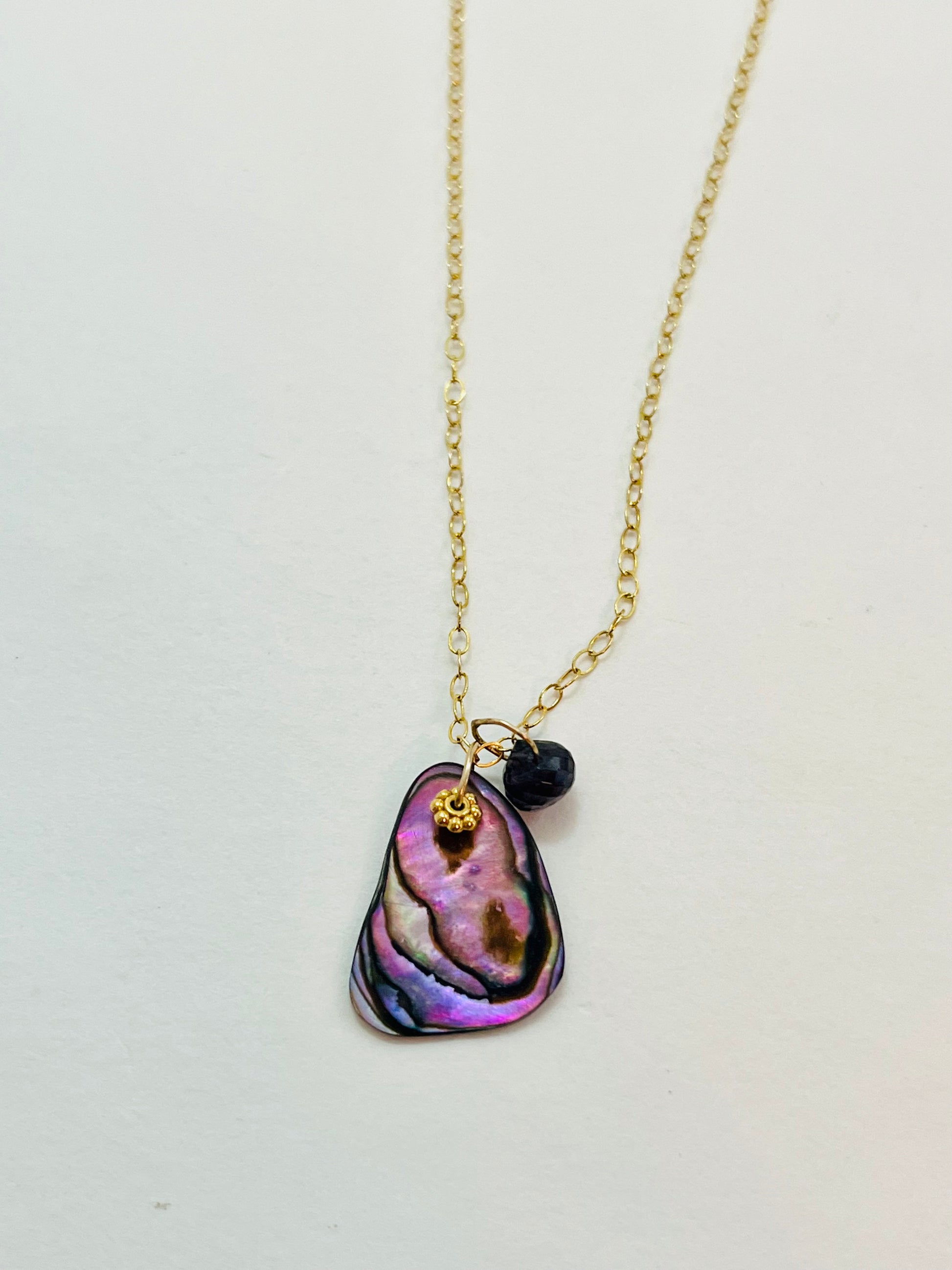 The Allegra necklace features a piece of found abalone shell, accented with a 14k gold fill Bali bead and hand-made 14k gold fill tourmaline charm. All are suspended from a delicate 14k gold filled cable chain. 14k gold fill spring clasp. 18 inches.