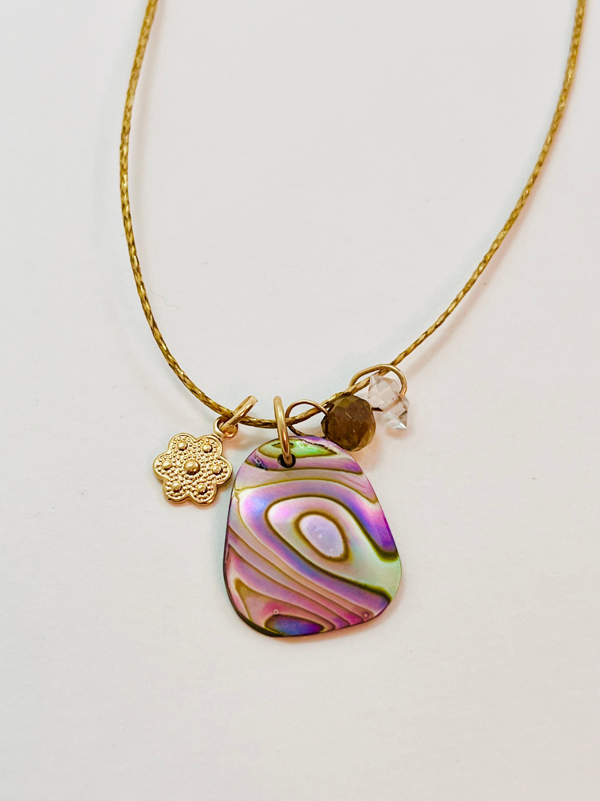 A found abalone shell 14k gold fill charm is the star of the show in this design. Two contrasting gold fill tourmaline charms, and gold fill flower charm, are the accents. All are suspended from hand made, metallic, waxed Greek cord. 14k gold fill lobster clasp. 17 inches