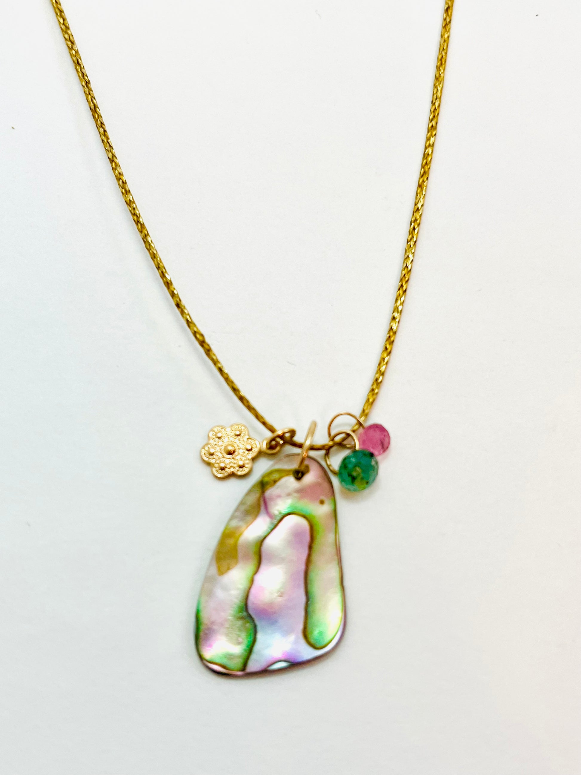 A found abalone shell 14k gold fill charm is the star of the show in this design. Two contrasting gold fill tourmaline charms, and a gold fill flower charm, are the accents. All are suspended from hand made, metallic, waxed Greek cord. 14k gold fill lobster clasp. 17 inches.