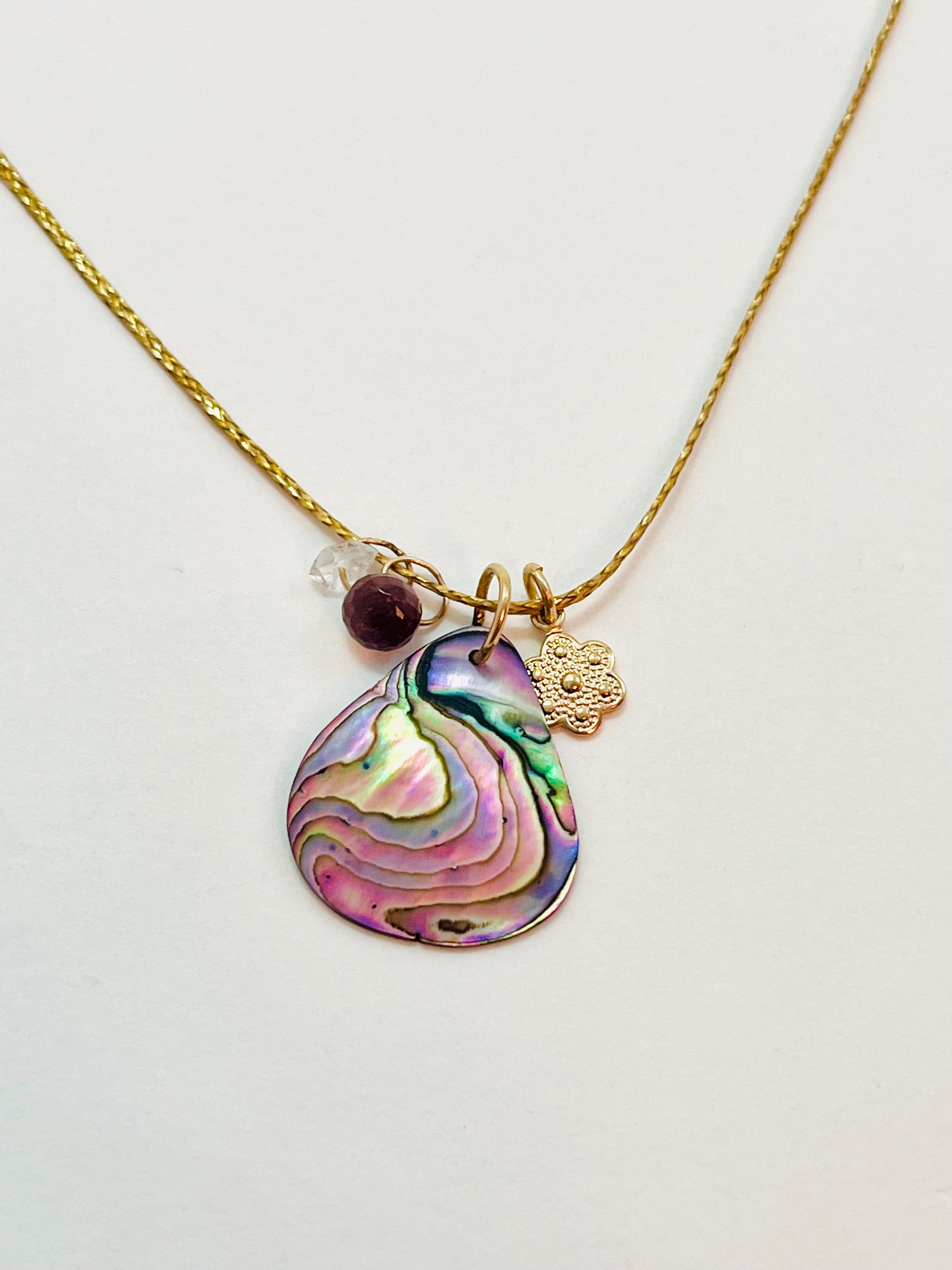 A found abalone shell 14k gold fill charm is the star of the show in this design. Pink Tourmaline, Herkimer crystal, and gold fill flower charms, are the accent. All are suspended from hand made, metallic, waxed Greek cord. 14k gold fill lobster clasp. 17 inches.