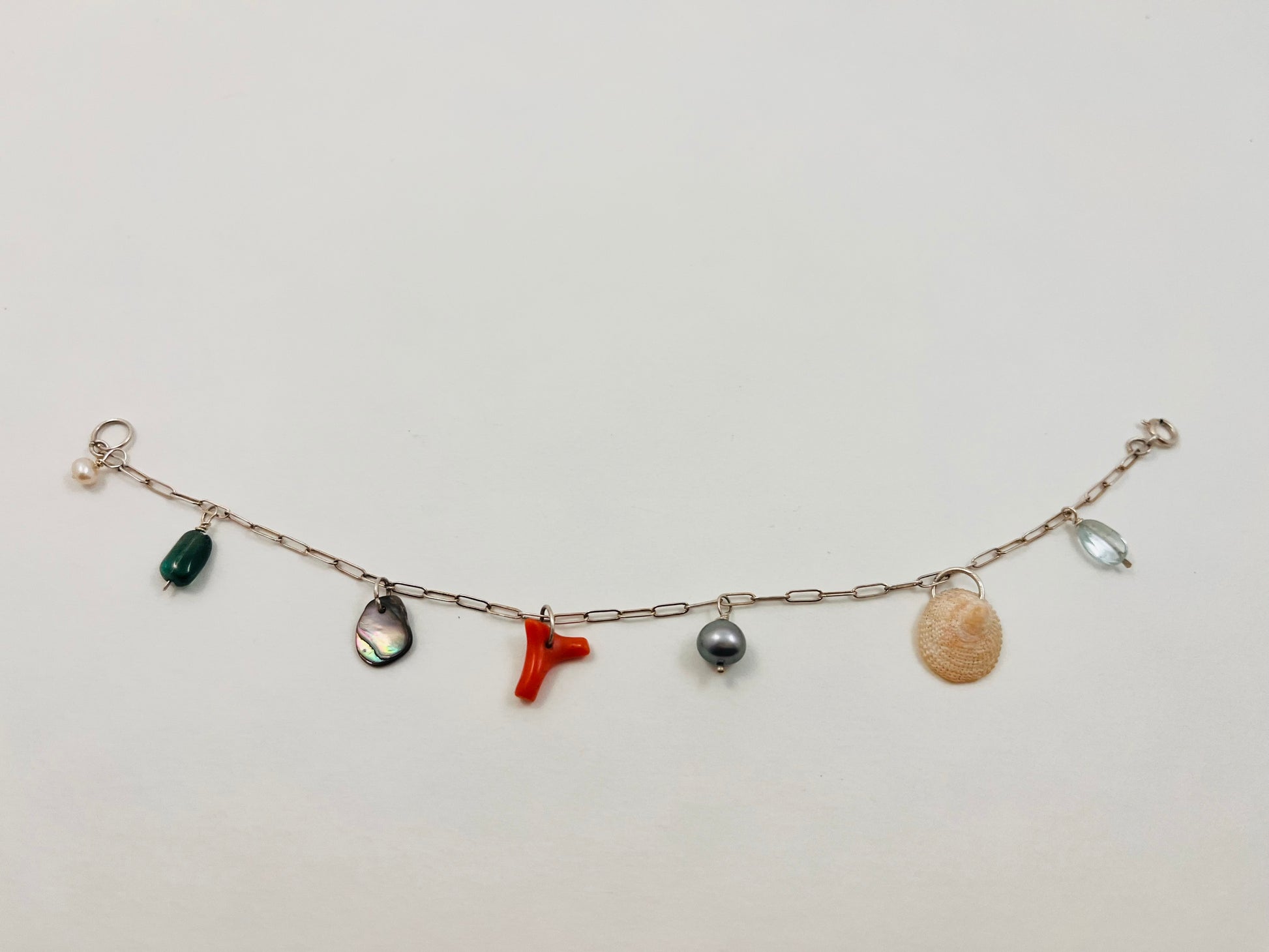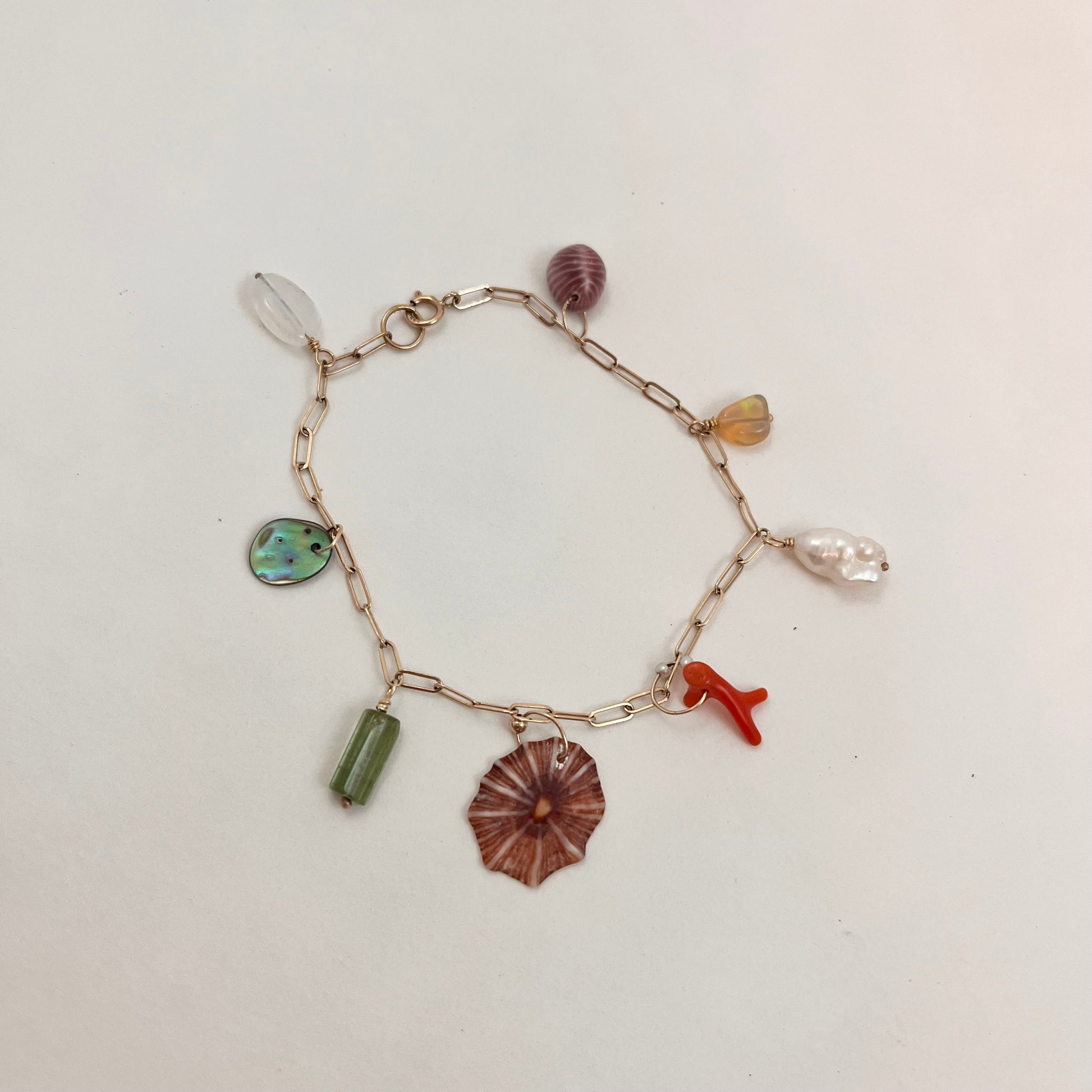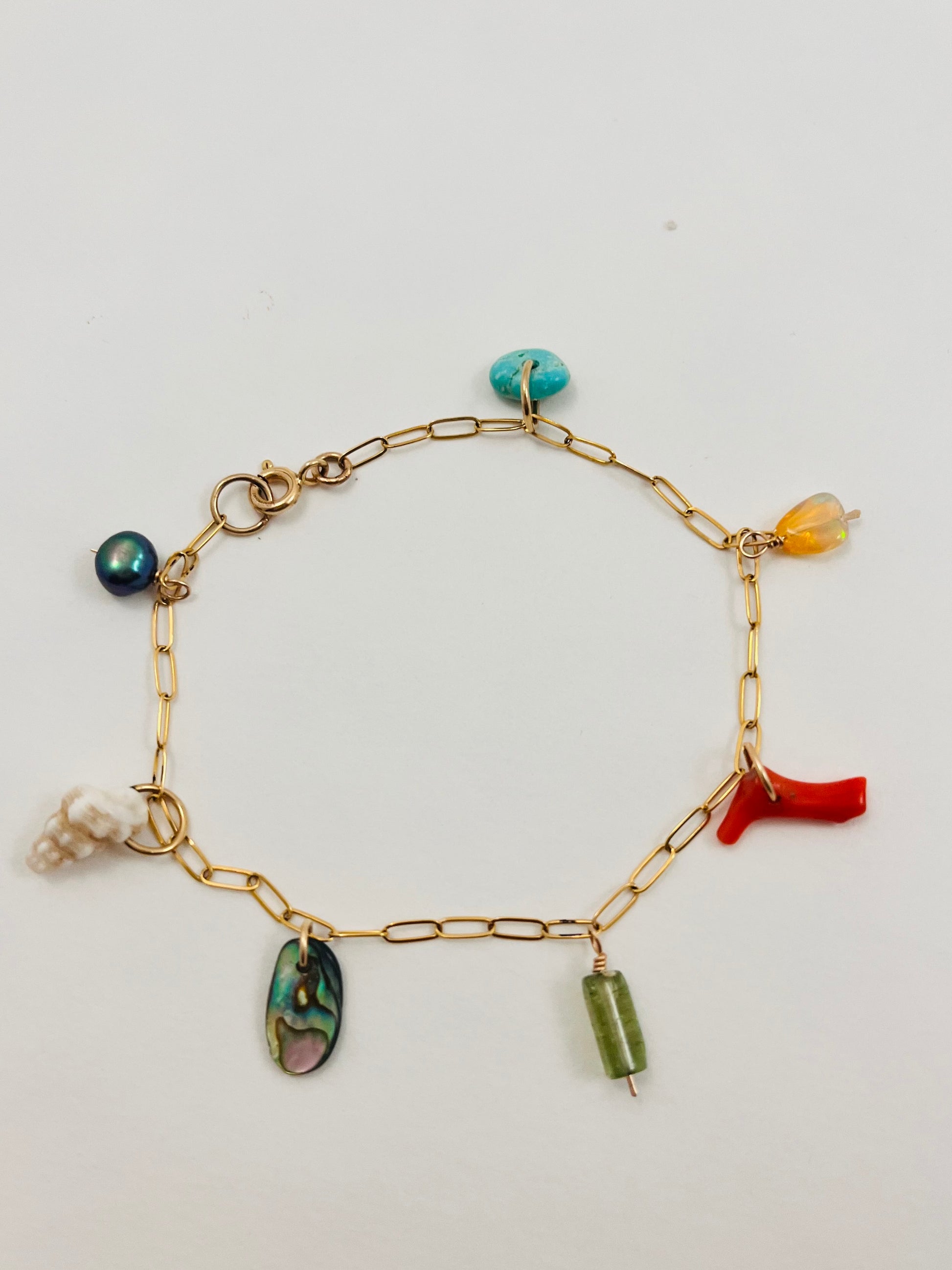 These custom charm bracelets feature gemstone beads, pearls, vintage coral, found shells and abalone from my beach combing. Each one is unique. Available in 14k gold (first three images) 14k gold fill, and sterling silver. Spring clasp. Choose your length. Shells may vary.