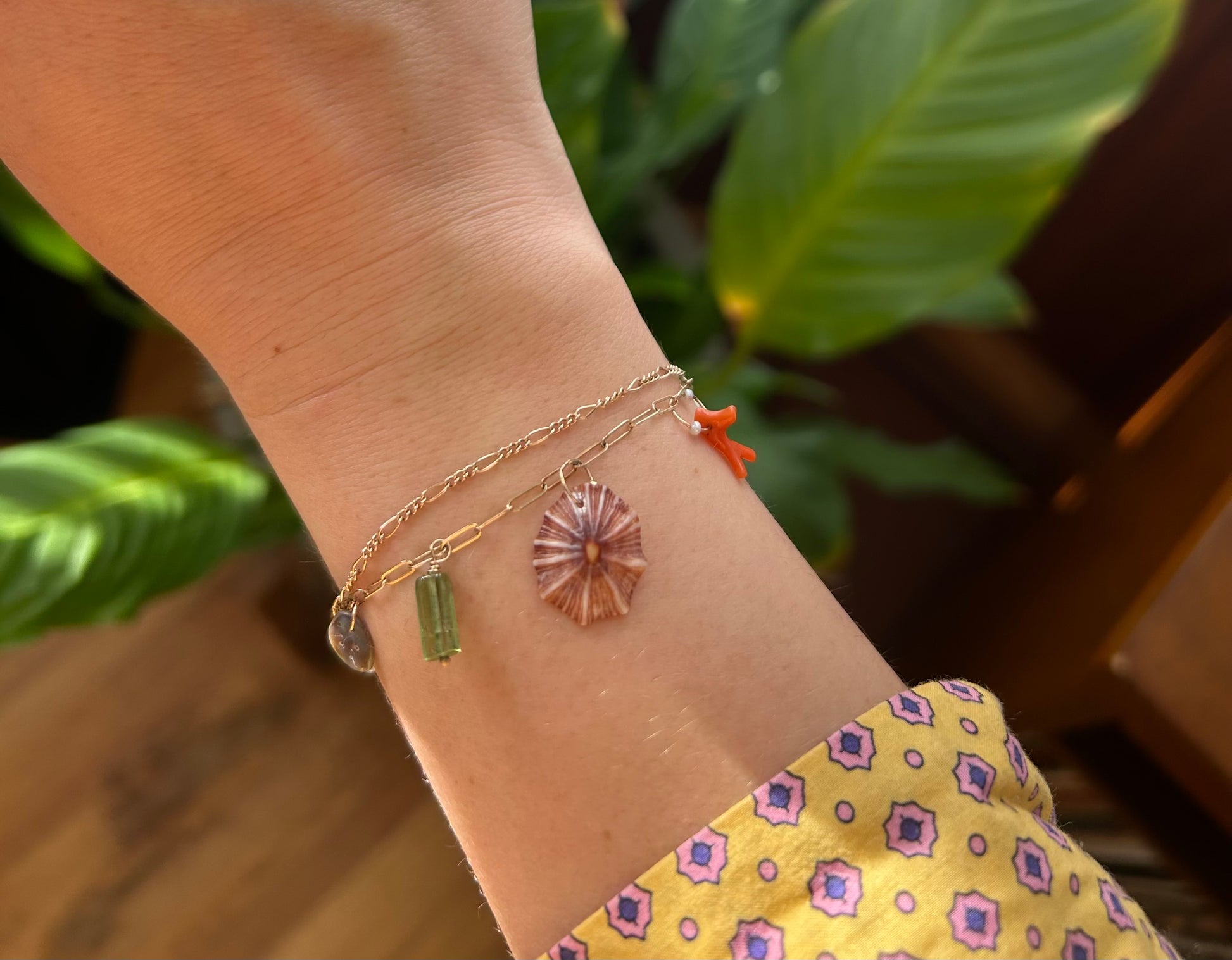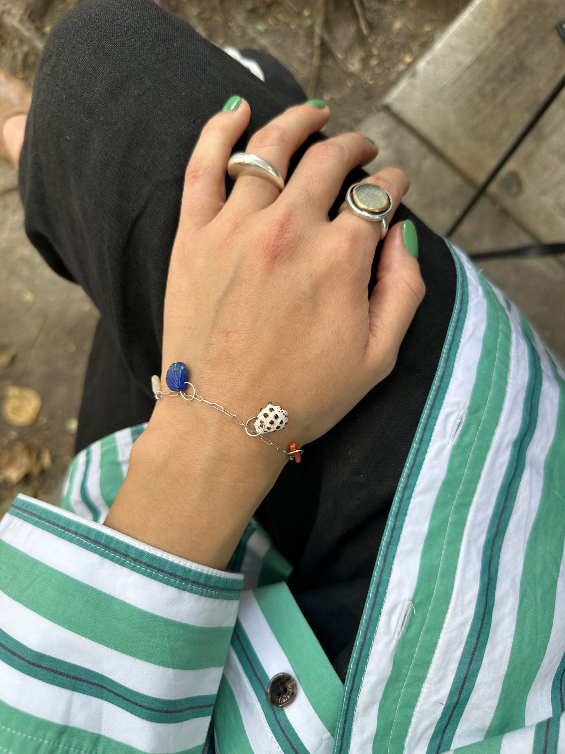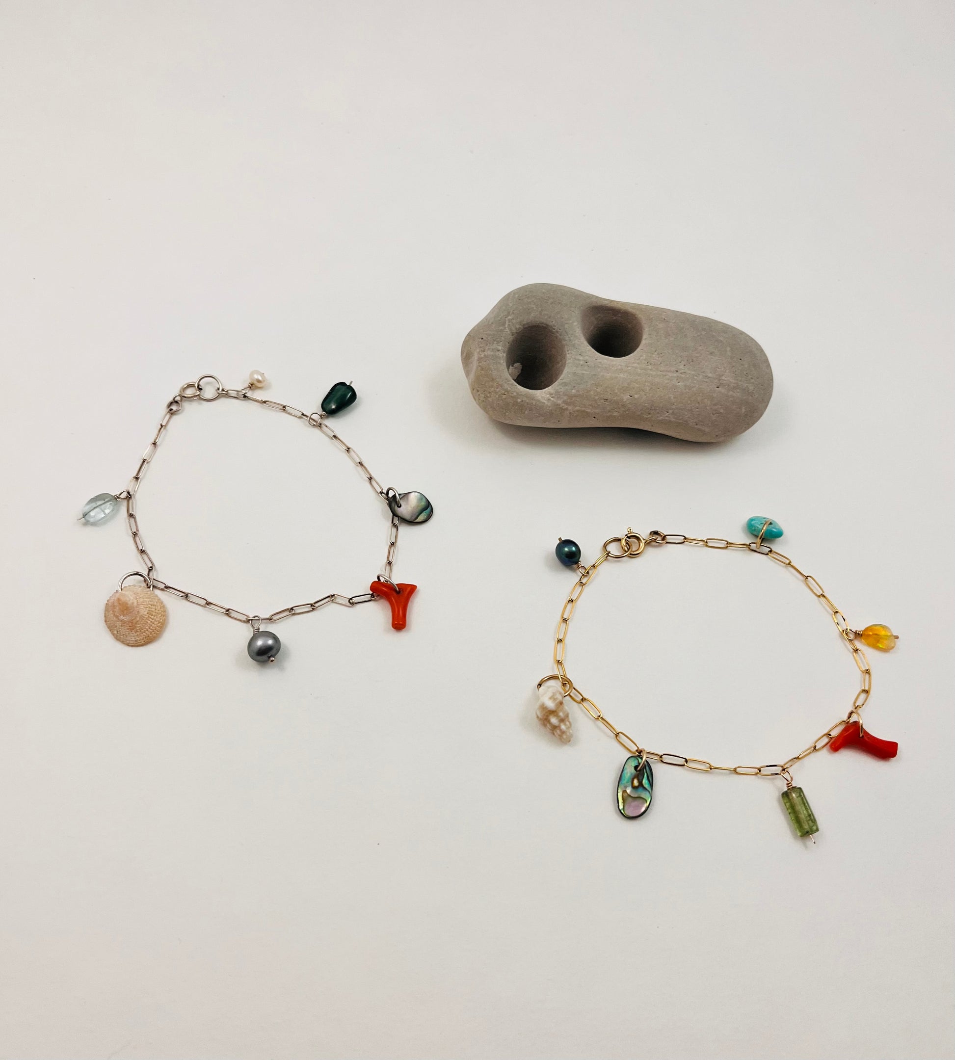 These custom charm bracelets feature gemstone beads, pearls, vintage coral, found shells and abalone from my beach combing. Each one is unique. Available in 14k gold (first three images) 14k gold fill, and sterling silver. Spring clasp. Choose your length. Shells may vary.
