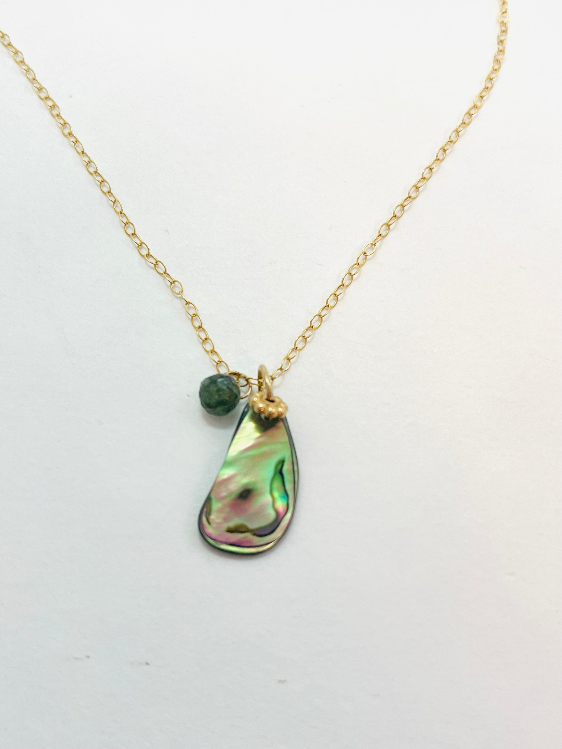 The Allegra necklace features a piece of found abalone shell, accented with a 14k gold fill Bali bead and hand-made 14k gold fill tourmaline charm. All are suspended from a delicate 14k gold filled cable chain. 14k gold fill spring clasp. 18 inches